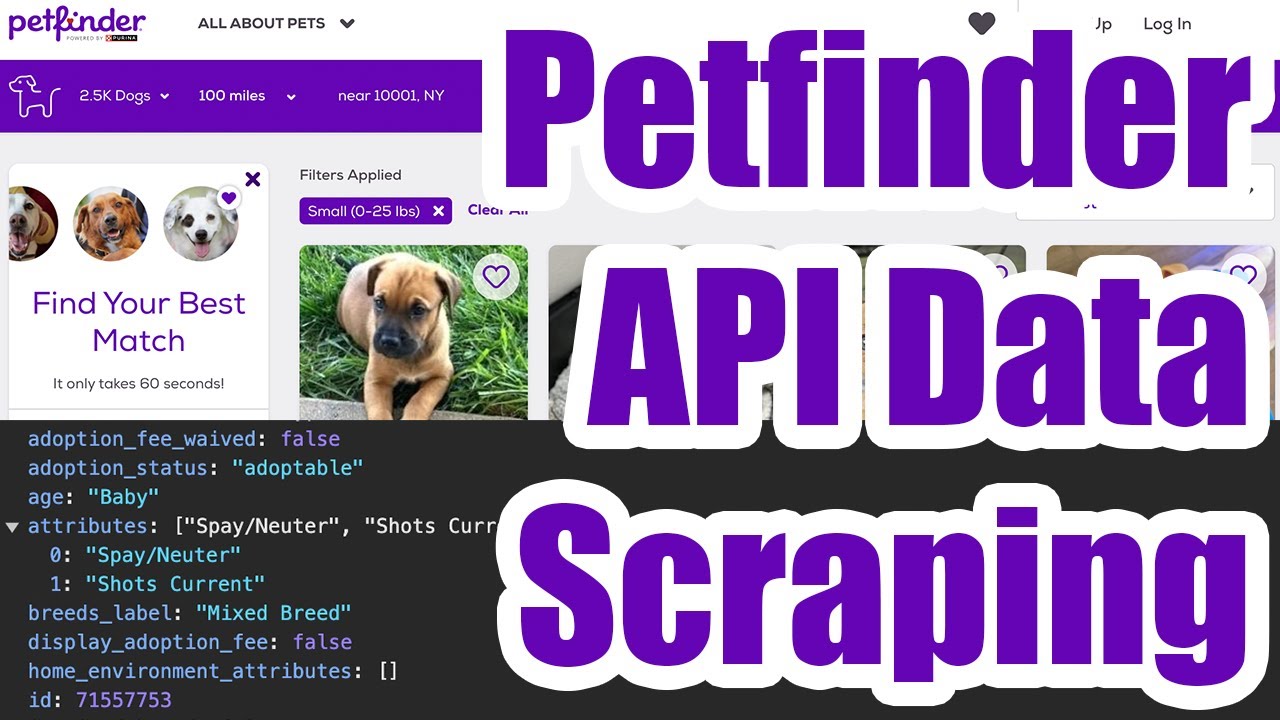 If you’re building an app or doing some research and need data about animals up for adoption, then look no further than Petfinder’s Official API, which allows you to easily access all of Petfinder’s public data that’s available through its website. You can use the API to form searches for pets within a single location and collect back a rich amount of data for each animal, including photos and details about the adoption (e.g. where the pet is available, how long they’ve been up for adoption, etc…).